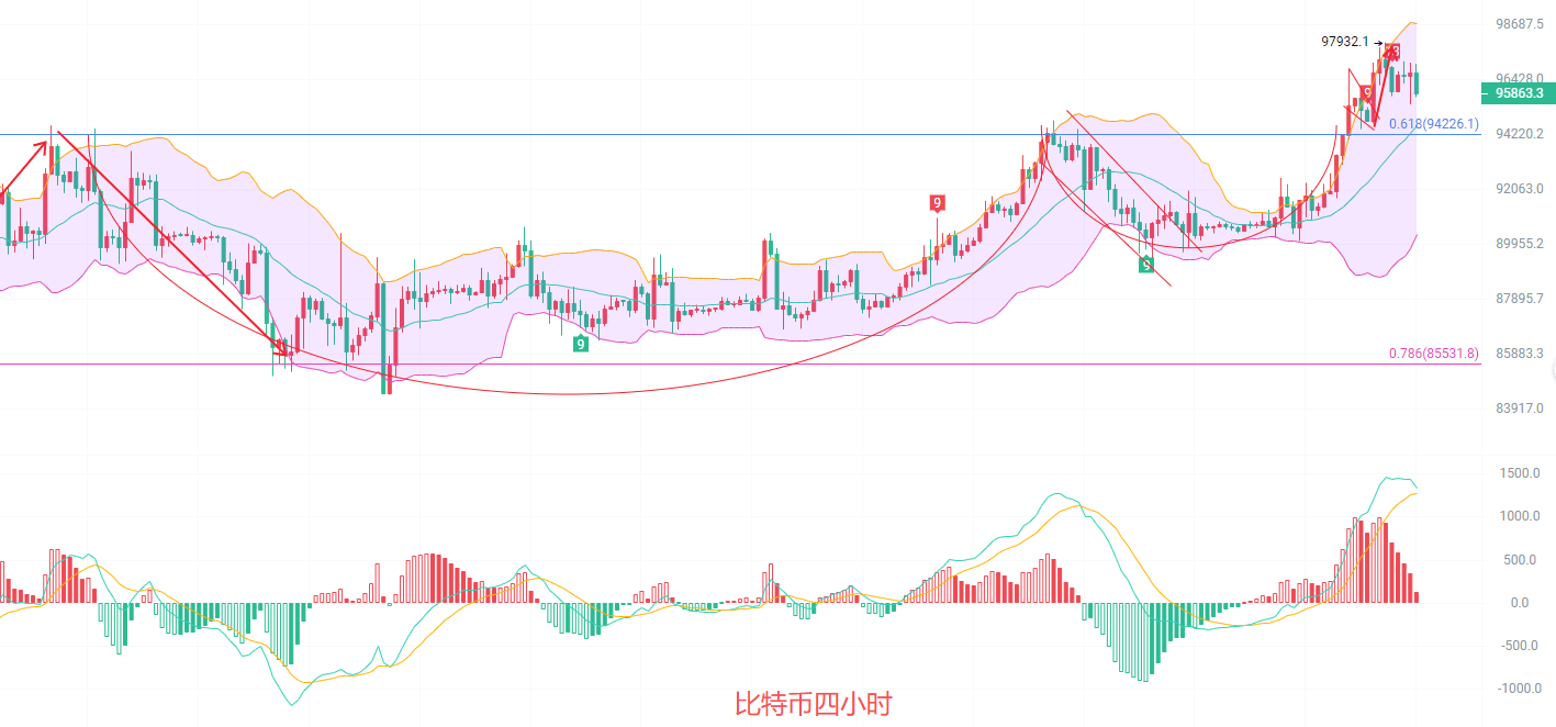 四小时K线上升旗型形态明显,EMA30和0.618分割线交替形成强压的94200,MACD顶部背离放量减少,K线遭遇强支撑,布林带中规关注94500,短线从96000到94500有回调的空间,不是很大也是有利可图,激进的币友可以抓一下,稳健的币友等回调支撑北上为主