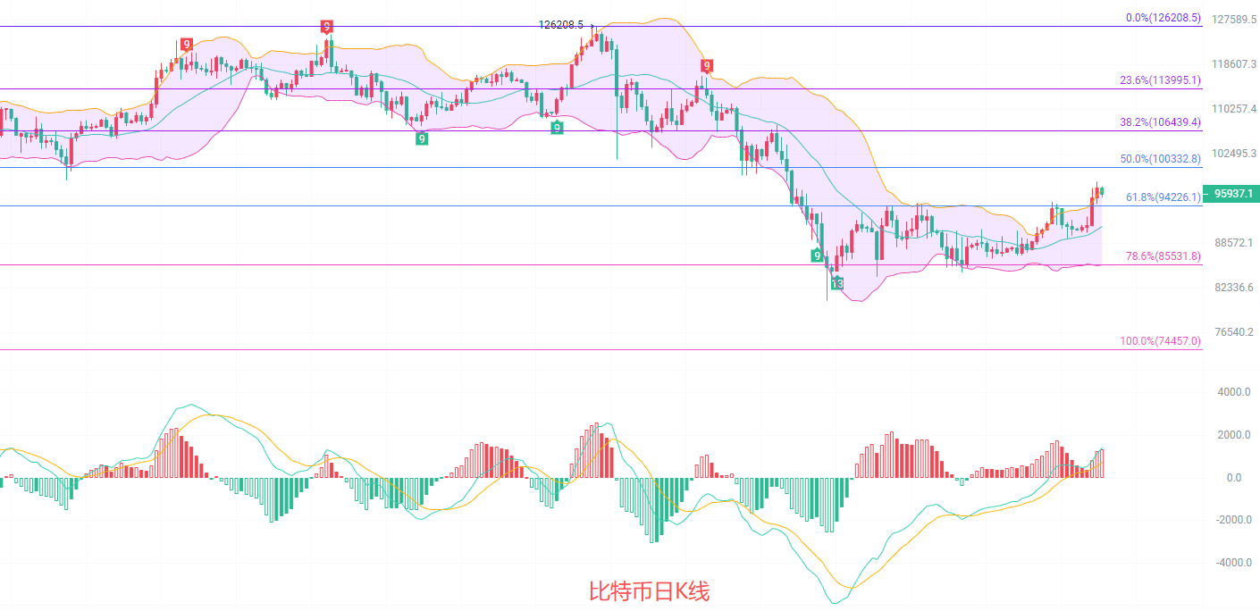 日K线发稿前最高97150,最低95400,EMA趋势指标多头趋势依旧在收缩,中线支撑在94000不变,MACD连续放量增筹,DIF和DEA向上扩散有减速的情况出现,EMA60趋势支撑关注95200,加上黄金分割线0.618支撑,底部的双支撑,给了北上几次入场时机,布林带上轨96600,目前K线回到了通道内,但趋势依旧是多