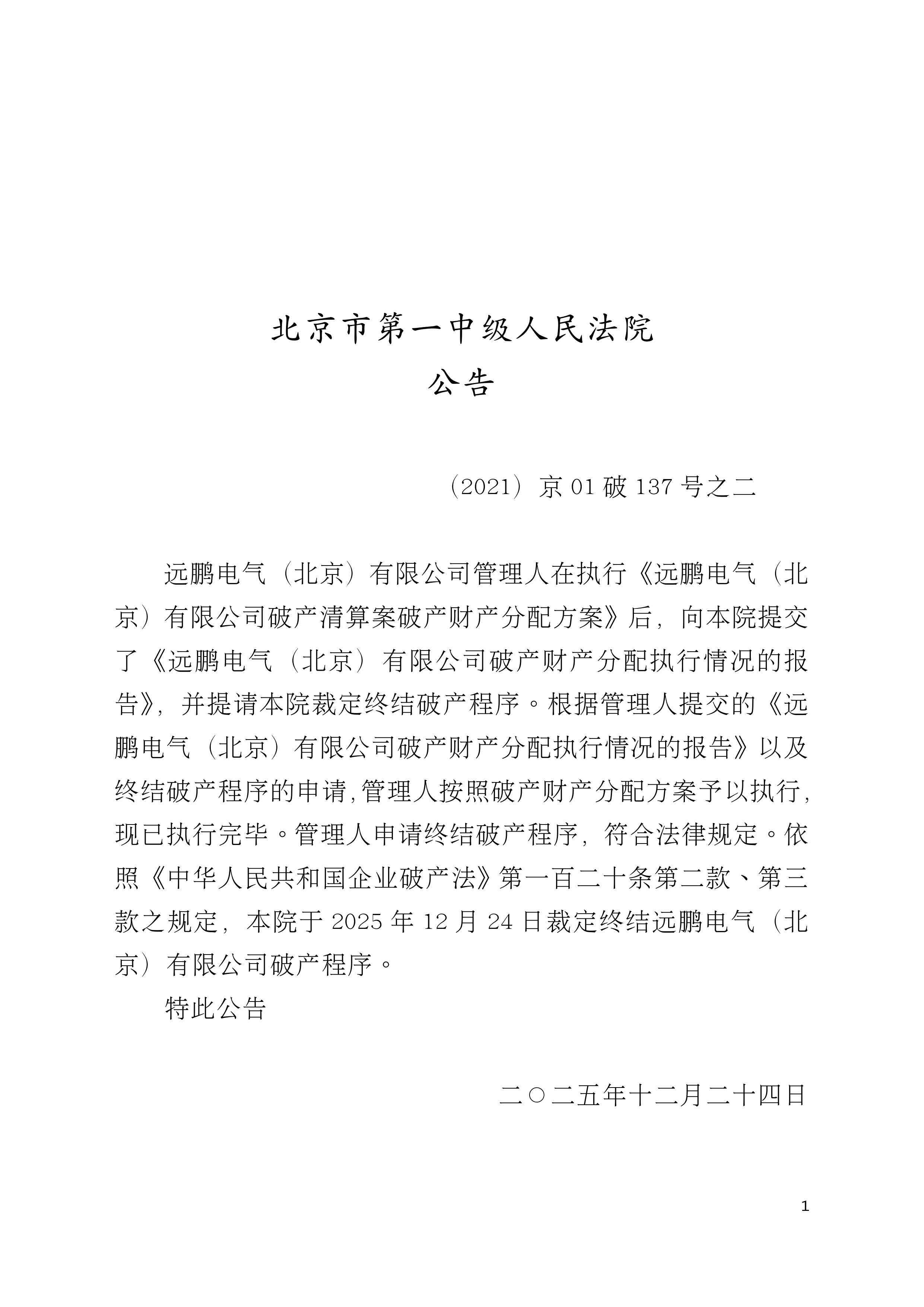 (2021)京01破137号远鹏电气(北京)有限公司终结破产程序-公告