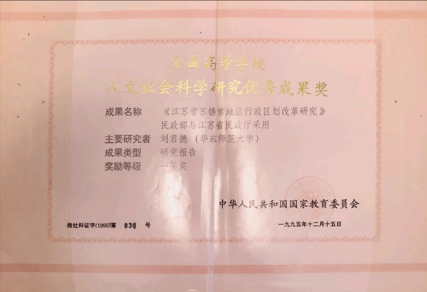 中心成立后,第一个重要课题就是对苏州、无锡、常州地区的行政区划研究,这也是中国第一次组织专家进行行政区划的战略研究。刘君德组织了八位学者,前后历时一年多,完成了研究报告《江苏省苏锡常地区行政区划改革研究》,报告包含数十万字与手工测绘地图100多张。报告递到民政部后,民政部高度认可了如此高效与细致的工作,报告主要内容被民政部与江苏省民政厅采用。而这一成果也获得了1995年由教育部颁发的全国高等学校人文社会科学政治学类研究优秀成果一等奖。