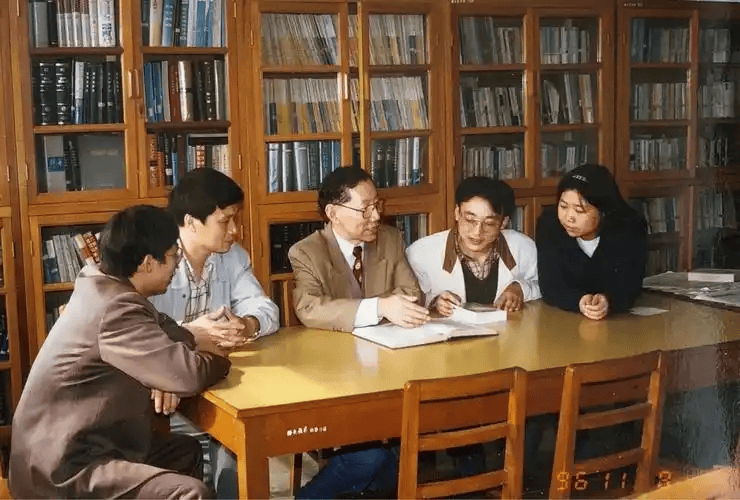 1996年,刘君德(居中)在中国行政区划研究中心与部分博士后、博士生商讨研究项目。