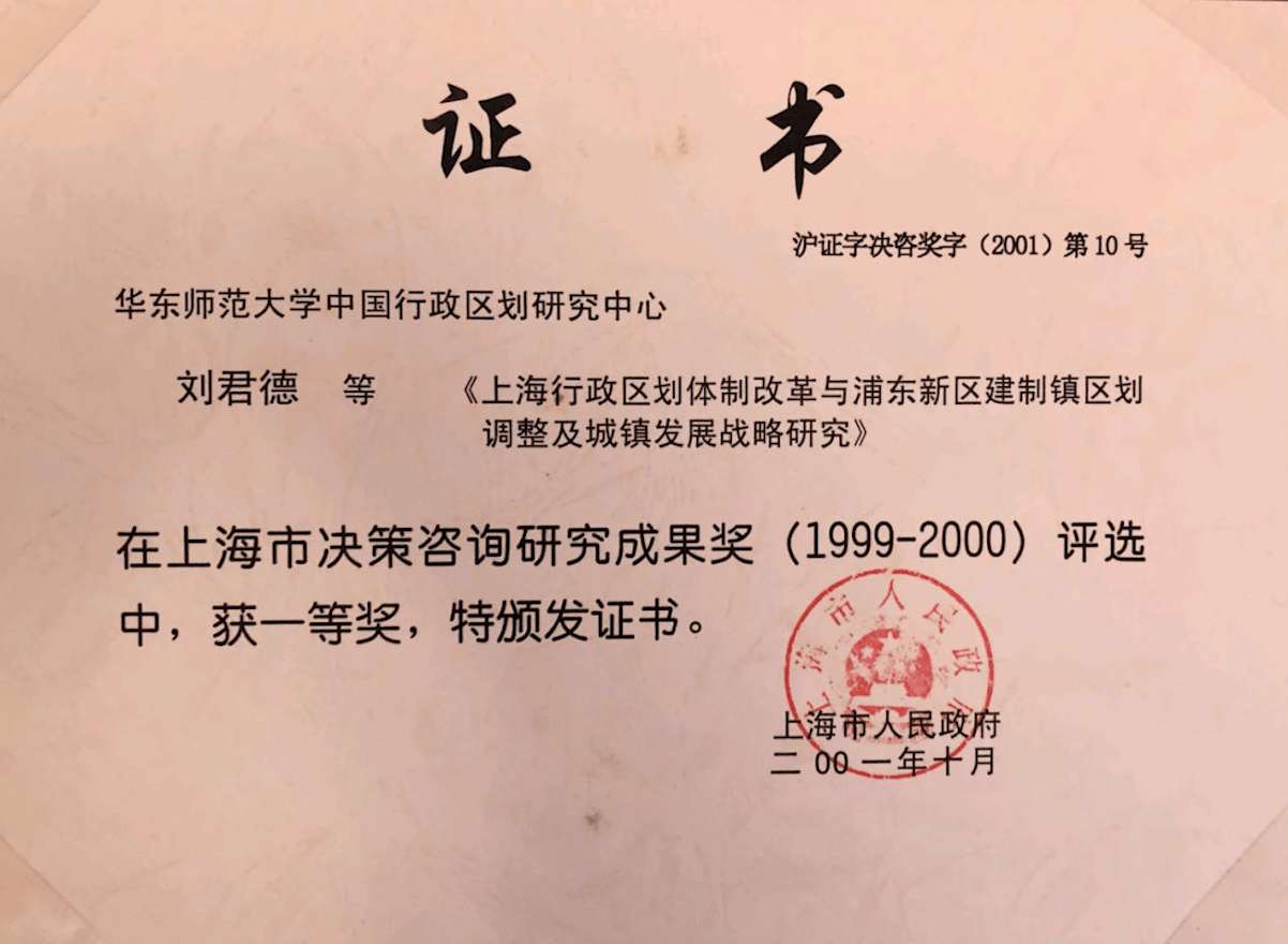 当然,刘君德除了开展全国野外调研外,他的研究还扎根上海。1990年代,随着改革开放的深化,对上海而言,也注定是不平凡的几年。随着浦东新区的成立,刘君德自然也要为这个蓬勃生长的“新生儿”建言献策。刘君德与相关专家,综合研判“大区制”“中区制”“小区制”的优势劣势,最终认为在中国目前国情下,保持中等区划体制是正确的。而浦东新区在原有基础上转型面临的主要问题,就是部分乡镇要转变为街道,且涉及到合并问题。此外,由于浦东新区地域广阔、人口众多,是否要在区政府与街道、乡镇之间再建立一级架构,都曾经是刘君德潜心钻研与深度思考的问题,这些研究最后形成了《上海行政区划体制改革与浦东新区建制镇区划调整》报告,并获得上海市决策咨询研究成果奖(1999-2000)一等奖。