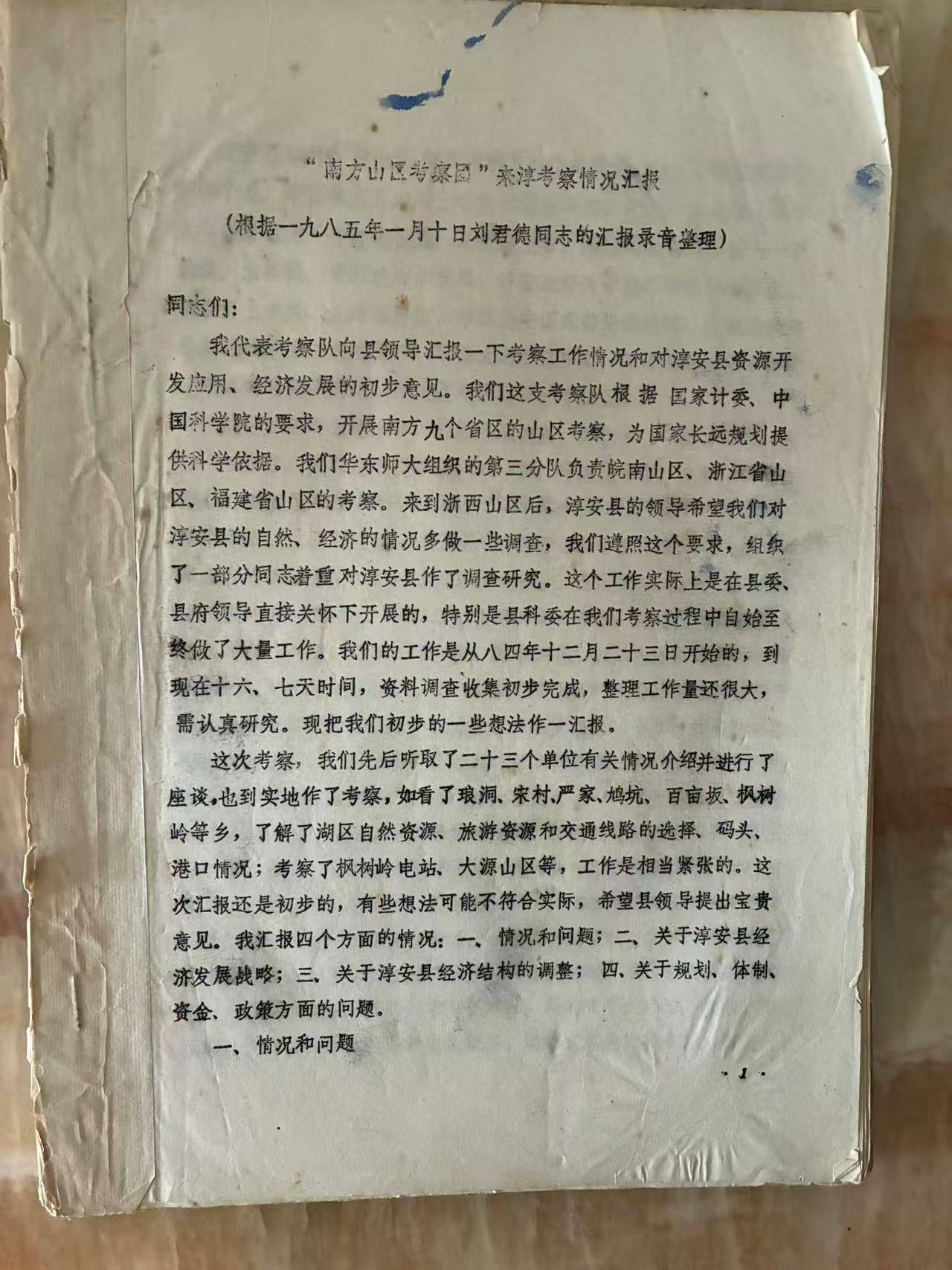 《“南方山区考察团”来淳考察情况汇报》录音整理稿,根据刘君德1985年在淳安县所作报告整理而成。