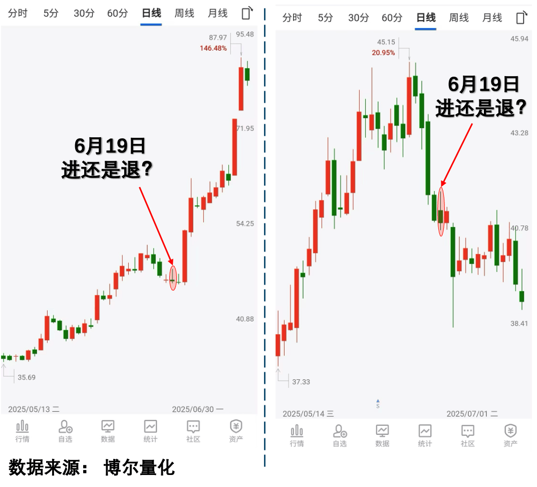 正如我在图中圈出的这个关键时间点,你会发现,股价后续的走向并不取决于当时市场的短期波动。回头看,左侧的股票不仅无需担心调整,甚至应该更有信心;而右侧的股票,不管市场是否短暂反弹,都应该保持警惕。