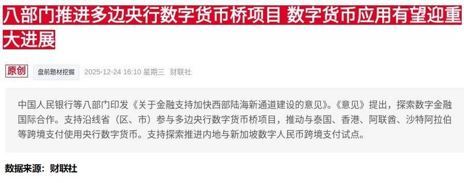 最近有条新闻挺有意思,央行等八部门联合发文,要大力支持西部陆海新通道的建设,其中特别提到了要探索数字金融的国际合作。简单说,就是咱们的数字人民币要加速“出海”了,未来要和泰国、香港、阿联酋这些地方搞跨境支付试点。