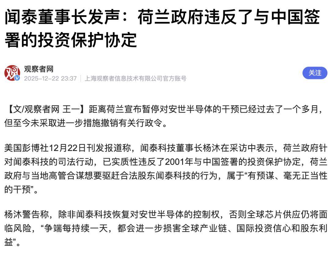 闻泰董事长发声:荷兰政府违反了与中国签署的投资保护协定12 月 22 日,闻泰科技董事长杨沐发声,指责荷兰政府针对安世半导体的司法行动违反中荷 2001 年投资保护协定,系与当地高管合谋驱赶合法股东的 “有预谋、无正当性干预”,该争端已致供应链分裂、全球芯片供应受冲击,下游车企发出停产预警。