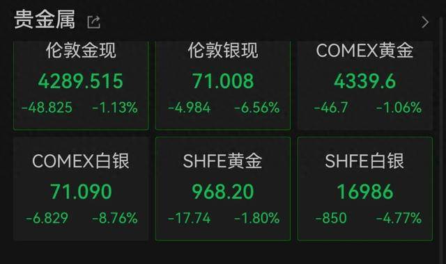 31日午间,国际贵金属市场全线走低。现货黄金跌破4300美元,现货白银跌超6%。截至发稿,现货黄金报4289.515美元/盎司,跌超1%,COMEX黄金期货同步跌1.06%;现货白银跌6.56%,报71.008美元/盎司。