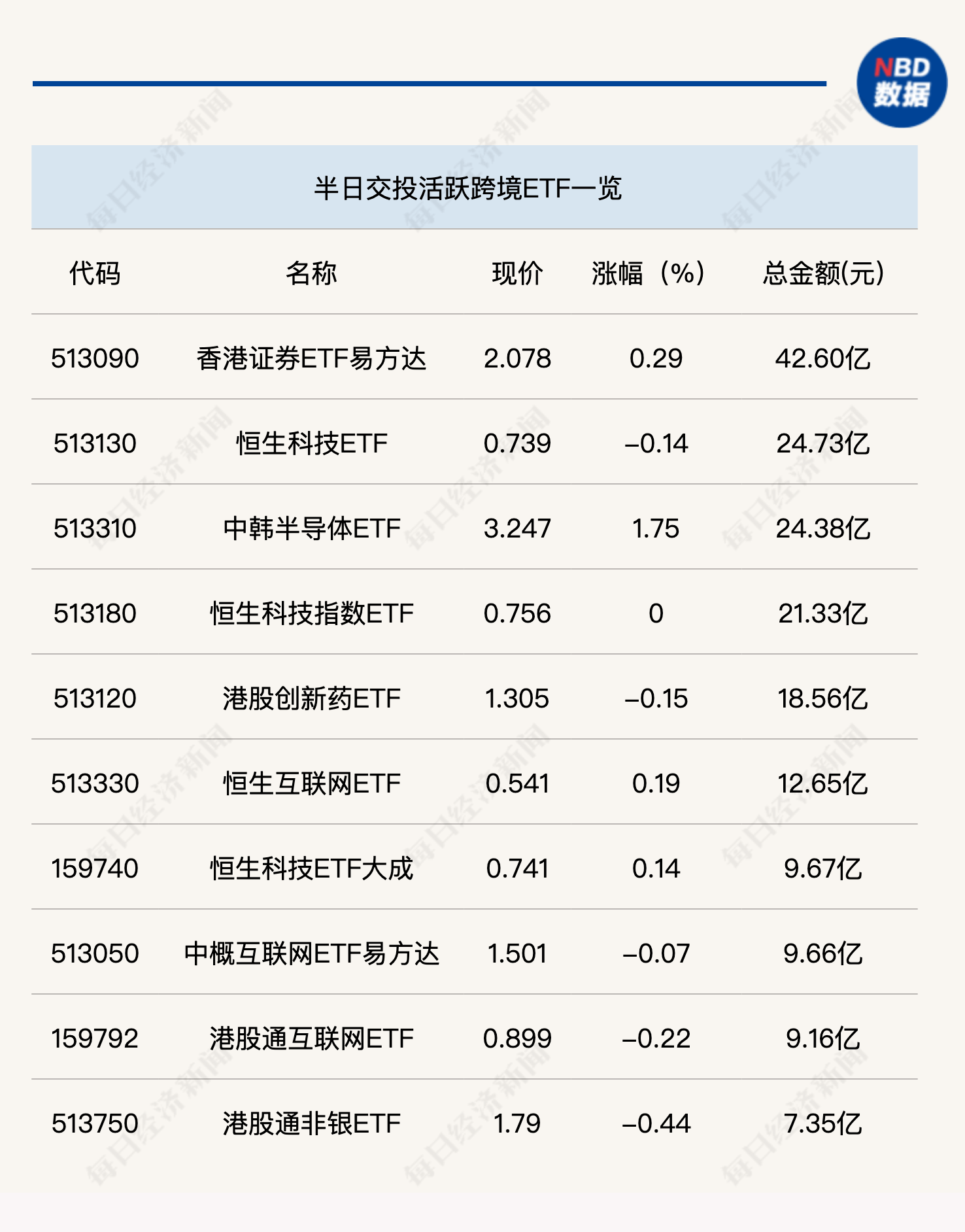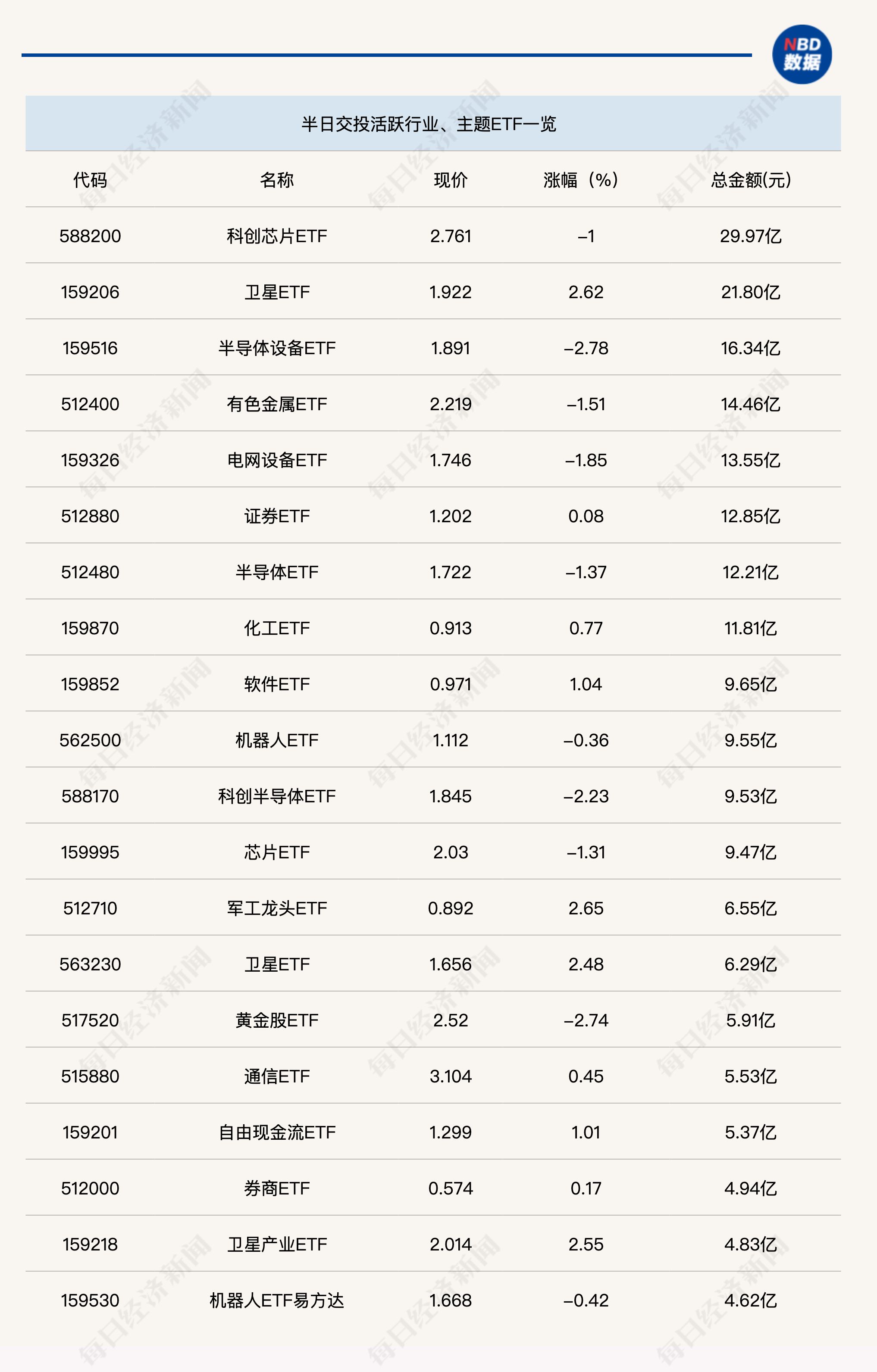 今日上午,科创芯片(588200)交易保持高活跃度,半日成交金额达到29.97亿元;调整数日的卫星ETF(159206)今日重新放量,半日成交金额为21.8亿元。跨境ETF方面,香港证券ETF易方达(513090)依旧是交易最活跃的品种,半日成交金额为42.6亿元。