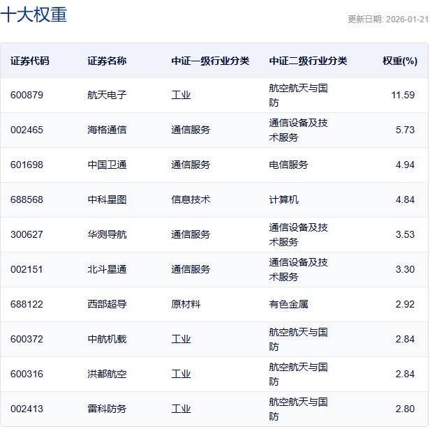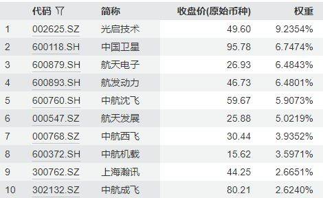 点评:航空航天ETF(563380)半日涨幅为3.55%,份额为5.91亿份,半日成交金额为2.19亿元,其追踪的是中证全指航空航天指数。中证全指航空航天指数以中证全指指数样本为基础,按中证行业分类,选取三级行业分类属于航空航天的股票作为样本。而从申万二级行业分类来看,该指数较全面覆盖航空航天产业链。