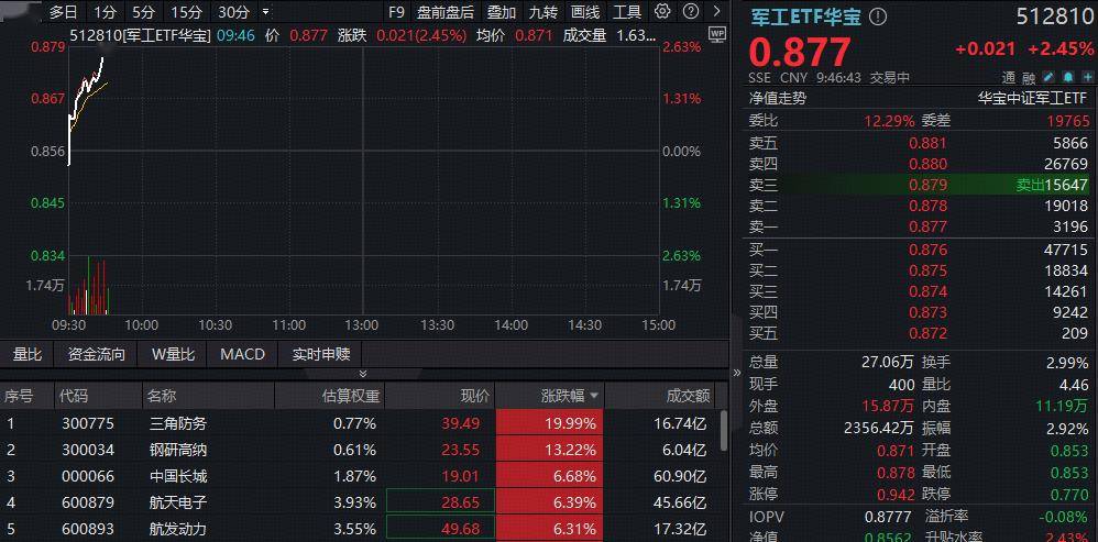 热门ETF方面,军工ETF华宝(512810)直线冲高2.45%,成交额快速突破2100万元。