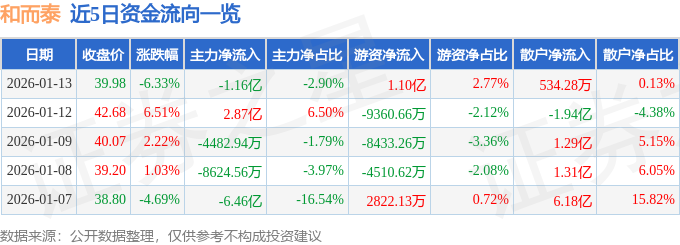 证券之星消息,截至2026年1月13日收盘,和而泰(002402)报收于39.98元,下跌6.33%,换手率12.14%,成交量97.8万手,成交额39.94亿元。