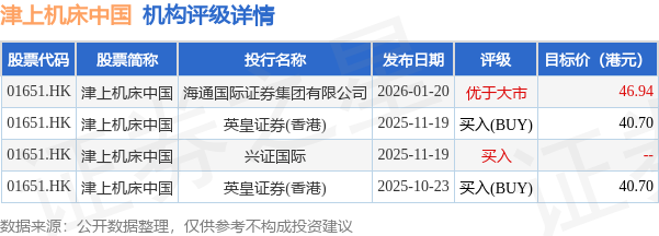 投行对该股的评级以买入(BUY)为主,近90天内共有2家投行给出买入(BUY)评级,近90天的目标均价为42.78港元。海通国际证券集团有限公司最新一份研报给予津上机床中国优于大市评级,目标价46.94港元。
