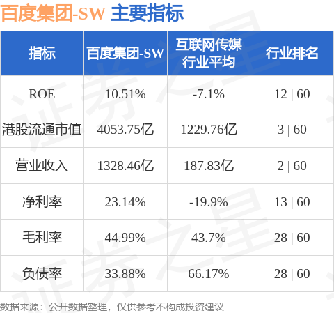 百度集团-SW港股市值4053.75亿港元,在互联网传媒行业中排名第3。主要指标见下表: