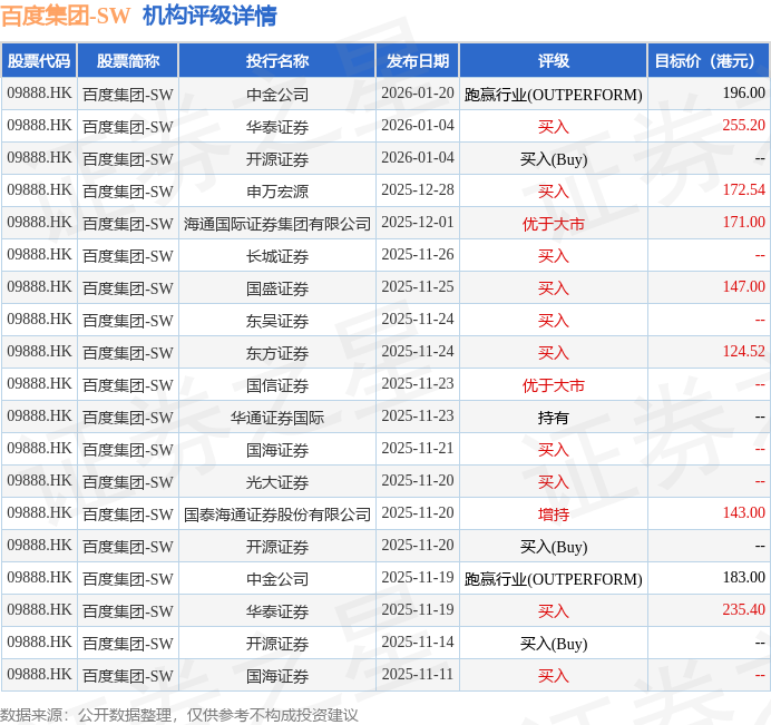 投行对该股的评级以买入为主,近90天内共有10家投行给出买入评级,近90天的目标均价为180.85港元。中金公司最新一份研报给予百度集团-SW跑赢行业(OUTPERFORM)评级,目标价196港元。