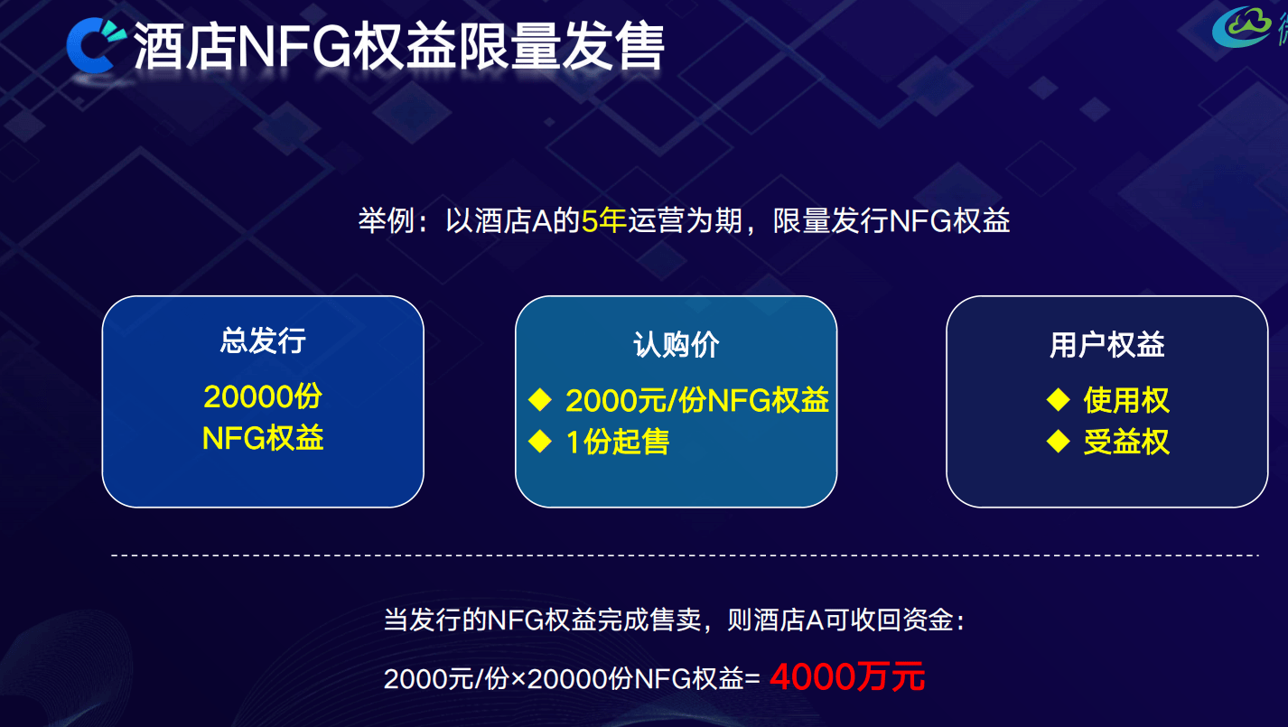 酒店A发行20000份NFG权益,每份2000元:用户小王购入100份,支付20万元,享有1000次住宿权(100份×10次/份),每次入住按房费10%付服务费(如300元房费付30元)