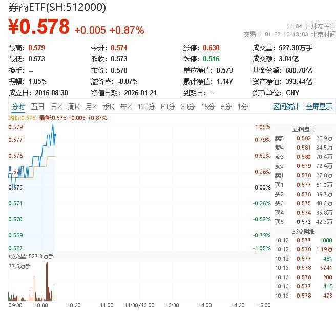 1月22日,券商板块表现活跃,截至发稿,财通证券涨超3%,国泰海通、太平洋、东方证券涨逾1%,顶流券商ETF(512000)场内价格一度涨逾1%,现涨0.87%,实时成交额超3亿元。