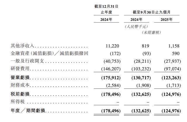 2024年、2025年前9月,普祺医药其他净收入分别为1122万元、115.8万元,年度/期间亏损分别为1.78亿元、1.25亿元。