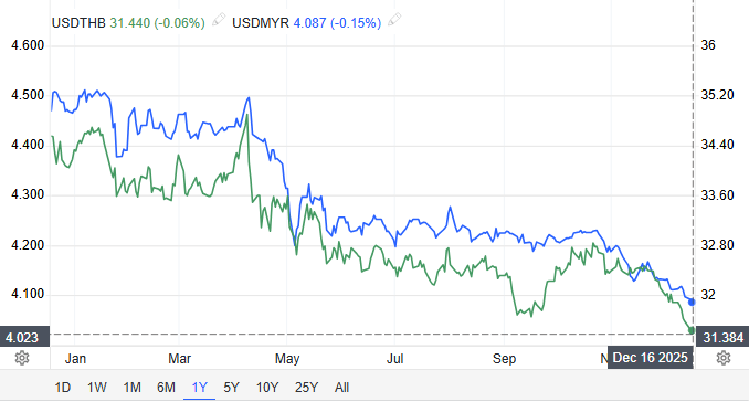 当然,如果我们从升值压力维度看,泰铢的处境具有特殊性。在东南亚货币中,泰铢升值幅度远超马来西亚林吉特、印尼盾等币种,但这与泰国经济增长不及预期形成鲜明反差,2025年三季度泰国经济增速弱于预期,通缩压力持续,而马来西亚、新加坡则凭借制造业韧性实现超预期增长。