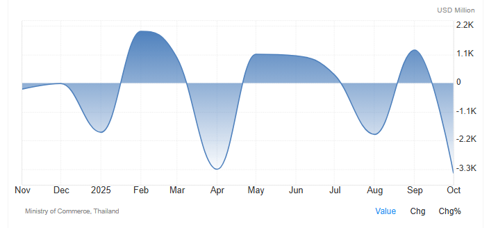 因为,泰国近80%的出口都以美元定价,泰铢三个月内12%的升值幅度(从36.8泰铢兑1美元升至32.3泰铢),已导致农产品出口商出现汇兑损失,食品出口增长预期从5%-7%骤降至3%甚至负增长。旅游行业更是大幅度叠加电诈问题承压,强泰铢抬高了外国游客的出行成本,进一步拖累本就复苏乏力的旅游业,而这两大产业贡献了泰国GDP的近40%,并且已经造成了泰国的经常性账户赤字,并出现贸易逆差!
