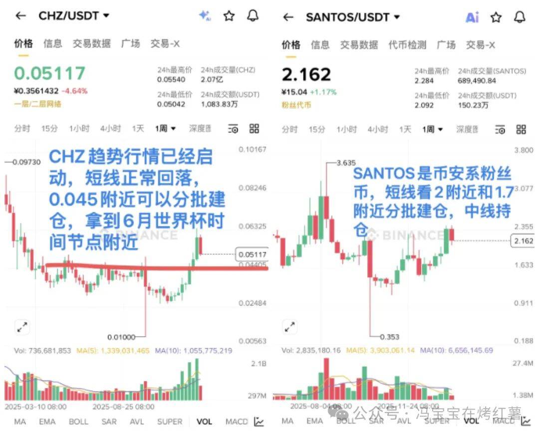 从流动性和市场热度考虑,龙头$CHZ和币安系$SANTOS更值得关注,其他粉丝币风险较高、更像彩票。目前整体成交额仍较低,说明关注者还不多,仍处于筹码收集阶段。