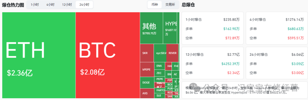 过去24小时全网共有142,424人被被爆仓,爆仓总金额为$6.06亿美元,多单爆仓3.05亿美元,空单爆仓3.00亿美元。