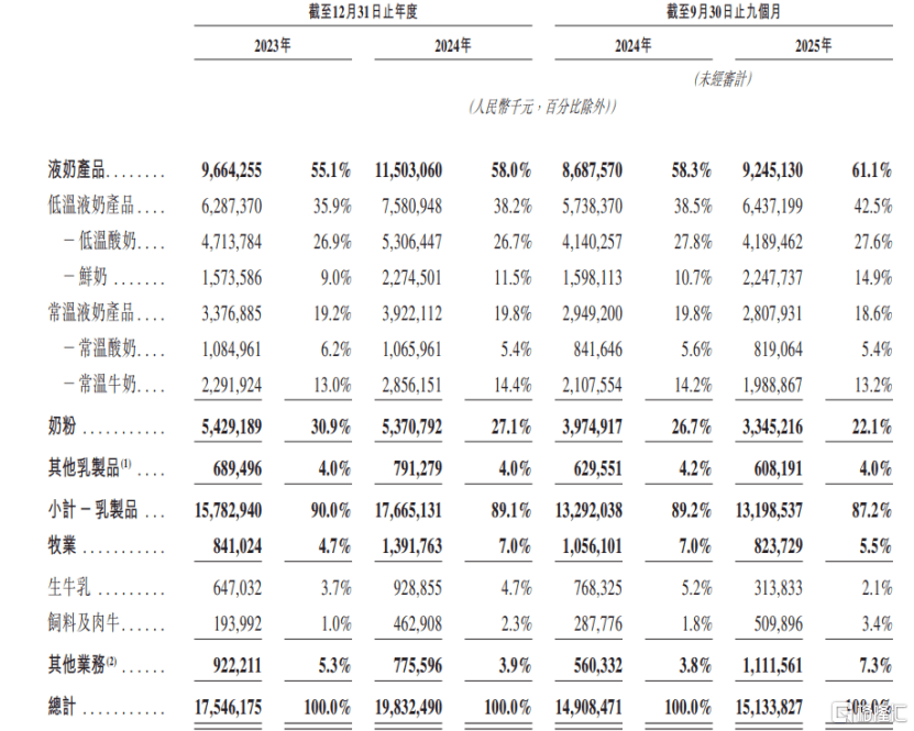 2025年1-9月,由于鲜奶、低温酸奶的销量增加,推动君乐宝整体收入增长。但受公司推出大规格产品,且供应给现制咖啡及茶饮连锁店的原料产品占比提升,而这两类产品的平均售价较低,导致鲜奶平均售价下滑。