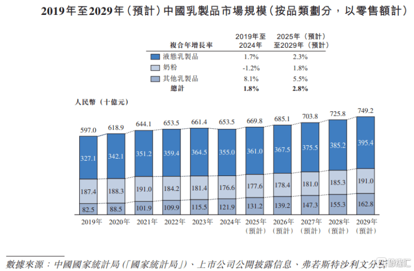 按零售额计算,2024年液态乳制品、奶粉产品的市场规模分别为3550亿元、1766亿元,分别占中国乳制品总市场的54.3%、26.7%,预计这两大细分市场2025年至2029年的复合年增长率分别为2.3%、1.8%。