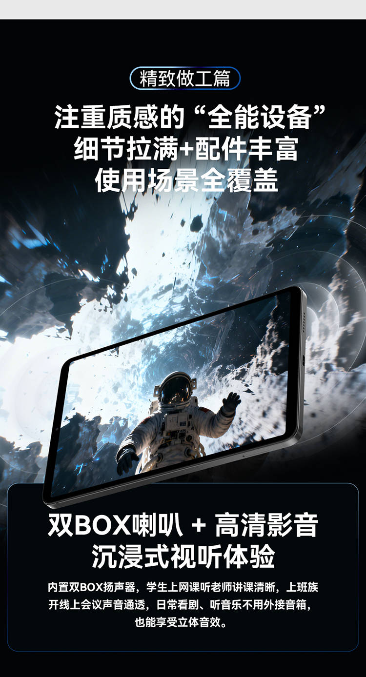 它并非只有“面子”,更有“里子”。全金属机身提供了坚固的保护与出众的质感;双BOX扬声器带来沉浸式影音;5000mAh电池搭配PD快充,保证了5-6小时的持续续航。此外,它还支持丰富的配件生态,从皮套、电容笔到游戏拉伸手柄,无论是学习笔记、移动办公还是畅玩模拟器游戏,都能无缝切换,满足全场景需求。
