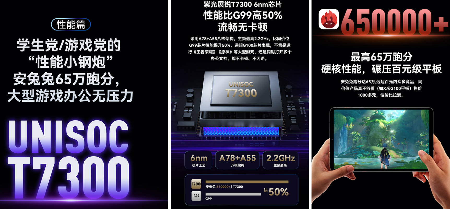 其心脏是全新UNISOC T7300 6nm芯片,一个在平板领域首次亮相的强大组件。凭借A78+A55旗舰级八核架构,其AnTuTu跑分高达65万(8+128GB版本),性能相较于主流的G99芯片提升50%,远超G100。这意味着,无论是学生党钟爱的《王者荣耀》,还是对硬件要求极高的《原神》,BPad T1都能提供流畅无卡顿的体验。