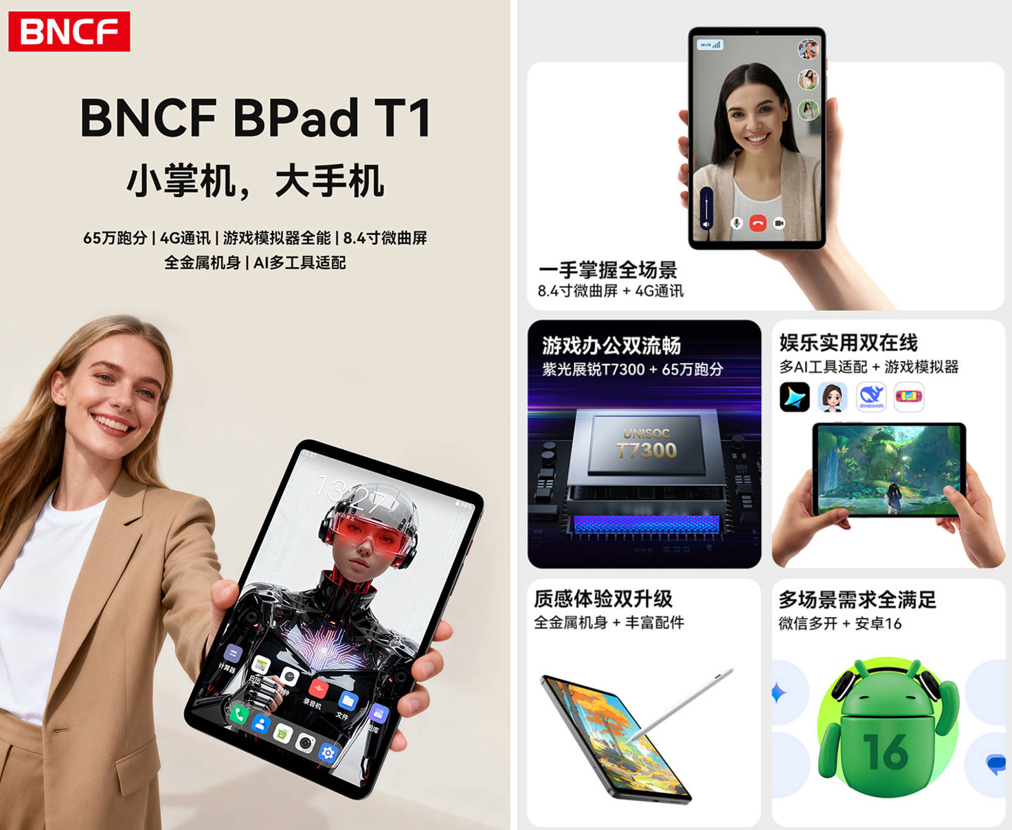 在平板电脑市场日益同质化的今天,一款真正敢于“破局”的产品出现了。新锐品牌BNCF(奔福)今日正式发布其T系列首款力作——BPad T1。这款产品以“小掌机,大手机”为核心定位,全球首发搭载UNISOC T7300高性能芯片,并创新性地将4G全网通、旗舰级性能与极致便携性融入不足千元的价格体系中,旨在为消费者提供一个前所未有的“口袋生产力与娱乐中心”。