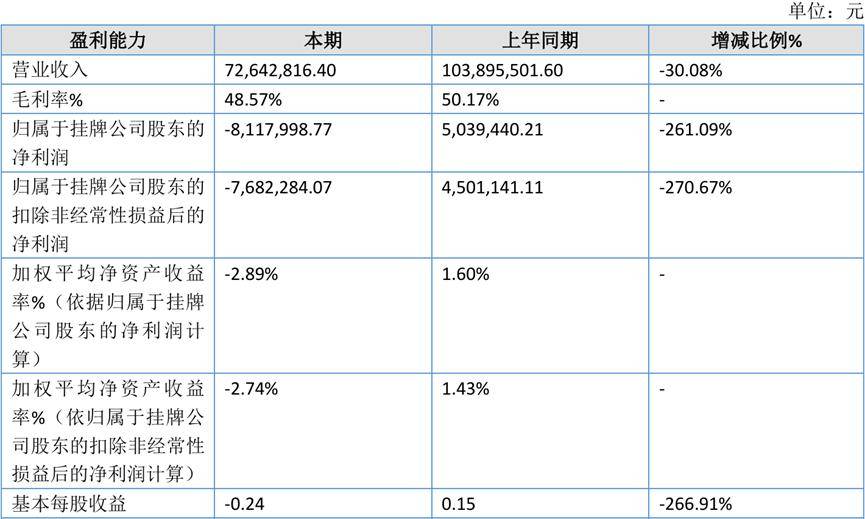 2025年1-6月,公司营业收入7,264.28万元,同比下降30.08%;归属于挂牌公司股东的净利润-811.80万元,同比下降261.09%;归属于挂牌公司股东的扣非净利润-768.23万元,同比下降270.67%。