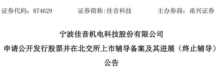 1月19日,新三板挂牌公司佳音科技(874629)公告披露,因现阶段公司经营情况及后续战略规划需要,公司拟对上市计划进行调整,甬兴证券已于2026年1月15日向宁波证监局报送了关于公司终止辅导备案的申请材料,宁波证监局已于2026年1月19日确认公司终止辅导。