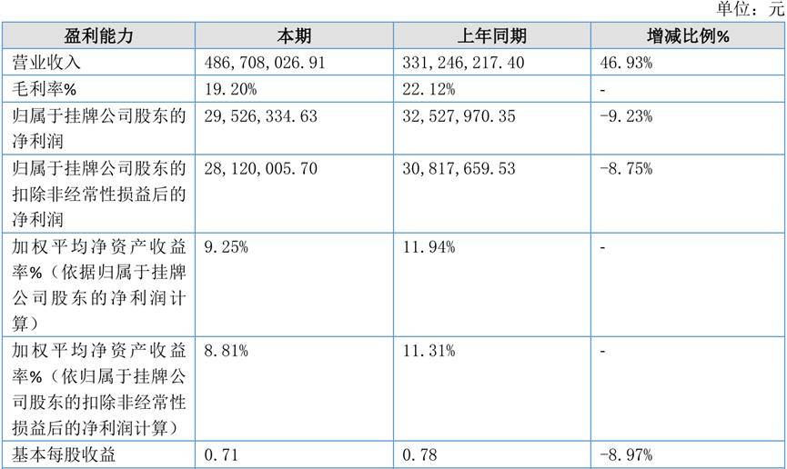 2025年1-6月,公司营业收入48,670.80万元,同比增长46.93%;归属于挂牌公司股东的净利润2,952.63万元,同比下降9.23%;归属于挂牌公司股东的扣非净利润2,812.00万元,同比下降8.75%。