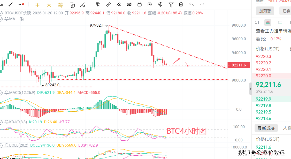 BTC在目前92300美元附近盘整。经过昨天的一波大跌后,到目前为止都在走结构性行情,在92000-93500区间震荡。日线级别MACD出现死叉,量能柱由绿转红,KDJ死叉延续,测试布林中轨支撑,目前中轨支撑有效,从技术上看变盘或将来临。支撑位90000-91000美元,若跌破90000美元关口,则下看可看到86000美元。阻力94000-95000美元。 中长线的多头趋势并未改变,短线进入回调中。 操作上91000-92000可分批建仓做多,94000附近轻仓空。ETH目前在3200附近震荡。操作上3100附近轻仓做多,3300附近轻仓空。(切记合约仓位控制在10%以内,带好止损)