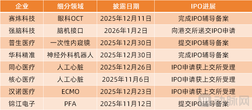 根据梳理,近期,眼科OCT、脑机接口、一次性内窥镜、神经外科机器人、人工心脏、ECMO、PFA(脉冲电场消融)等细分领域,均有企业启动IPO流程。