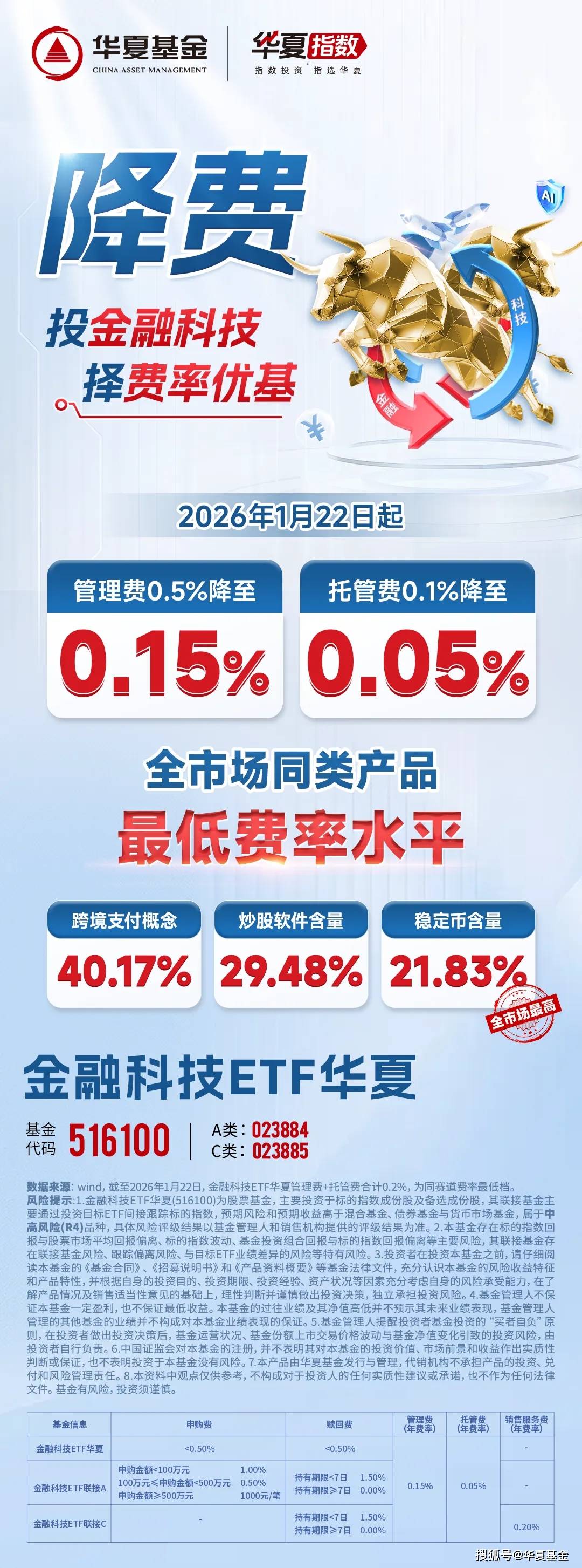 为了更好地服务广大投资者,降低投资者的理财成本,自2026年1月22日起,调低金融科技ETF华夏(516100)的管理费率、托管费率,其中管理费率将由0.50%下调至0.15%(年费率),托管费率由0.10%下调至0.05%(年费率),与联接基金一致。