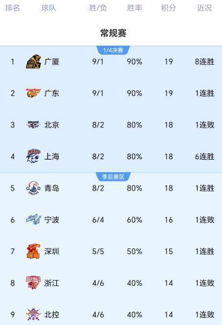 经过这几场激烈的较量,CBA最新的积分榜也随之出炉。浙江广厦队以9胜1负的战绩,凭借对北京队的双杀优势,荣登榜首。广东宏远队同样是9胜1负,但因相互战绩或小分劣势,暂列第二。青岛国信水产队以8胜2负的战绩排名第三。北京北汽队同样是8胜2负,但由于两场失利均是负于广厦,排名下滑至第四。上海久事队凭借六连胜的强劲势头,积分紧追不舍。