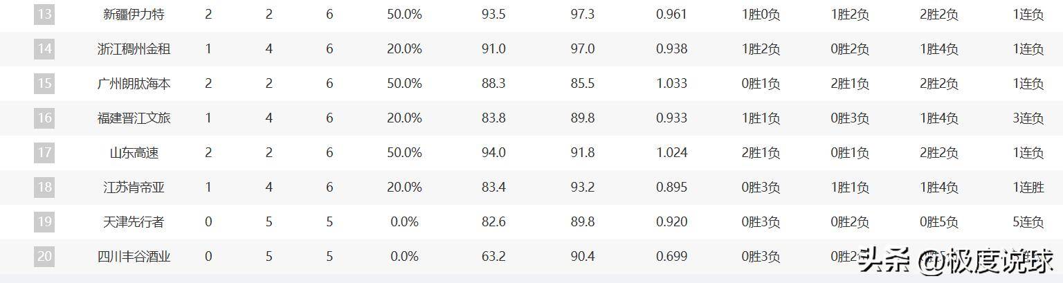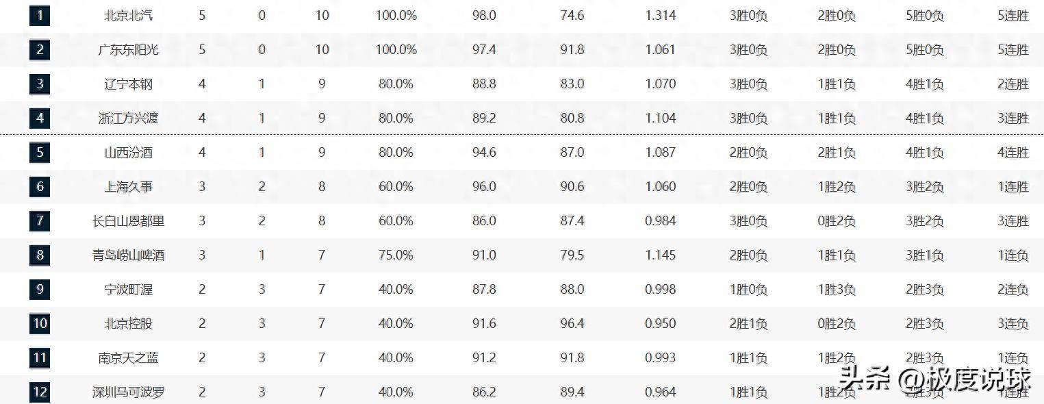 CBA联赛第五轮比赛继续进行,这一天的比赛结束之后,积分榜也是有了很大的变化,先看一下具体的比分情况,广厦84-65福建,广州85-93广东,上海97-77浙江,南京77-103山西。这天的比赛结束之后,广东男篮重回第二,广厦赢球之后也打进了前四,江苏拿到首胜之后,只有四川和天津战绩是全败。