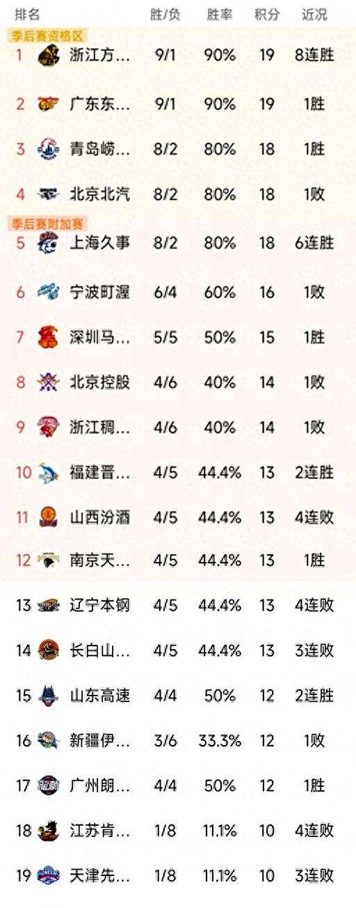 本轮过后,CBA积分榜发生了显著变化。广厦以9胜1负领跑,广东紧随其后,两队形成了第一集团。北京、青岛、上海同积8胜2负,组成了争冠的第二梯队。深圳、浙江稠州等队伍则在中游位置展开激烈争夺。而四川队的十连败让他们在积分榜上垫底,重建之路任重道远。