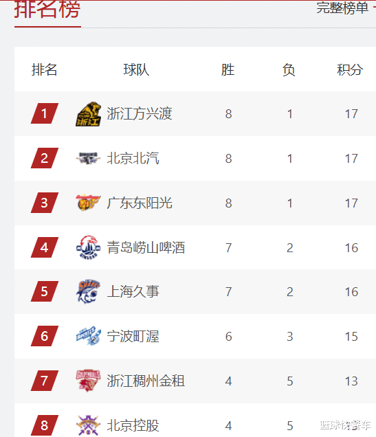 值得一提的是,在广东队与北京队鏖战之际,广厦队悄然坐收渔翁之利。他们在取得大胜的同时,凭借着小分优势力压群雄,重返积分榜首位。