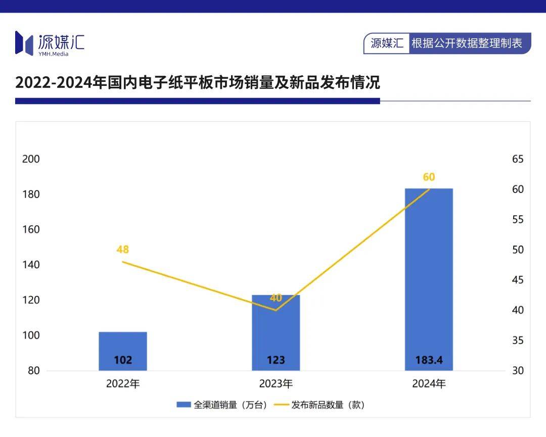 洛图科技数据显示,2023年中国电子纸平板销量为123万台,同比增长20.6%;2024年销量又进一步增长49.1%至183.4万台。尽管2023年国产品牌新品发布频率有所降低,但进入2024年,机海战术来得更加猛烈,合计发布60款新品。