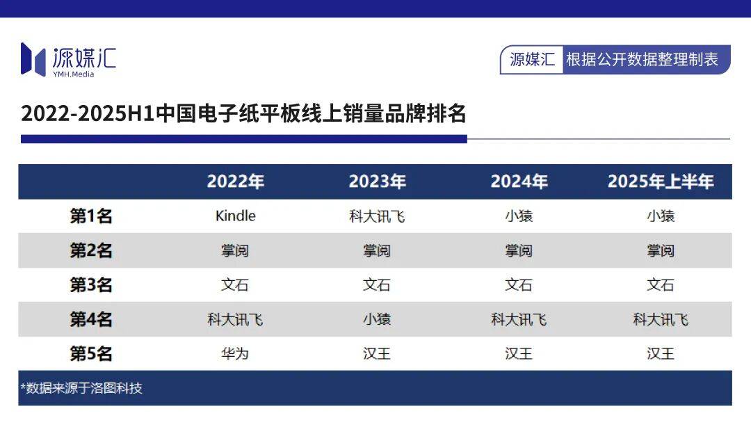 在洛图科技披露的数据中,2022年至今,文石一直位列国内电子纸平板线上市场第三名,掌阅则稳居第二名,期间唯独第一名是“轮流坐庄”——2023年为科大讯飞,2024年及2025年上半年为小猿。