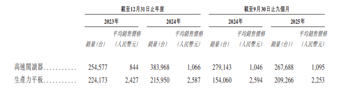 其中,2024年,文石的阅读器产品销量同比增长50.8%至38.4万台,平板产品则下跌3.67%至21.6万台;2025年前三季度出现反向情况,阅读器产品销量同比下滑4.1%至26.8万台,平板产品则增长35.8%至20.9万台。