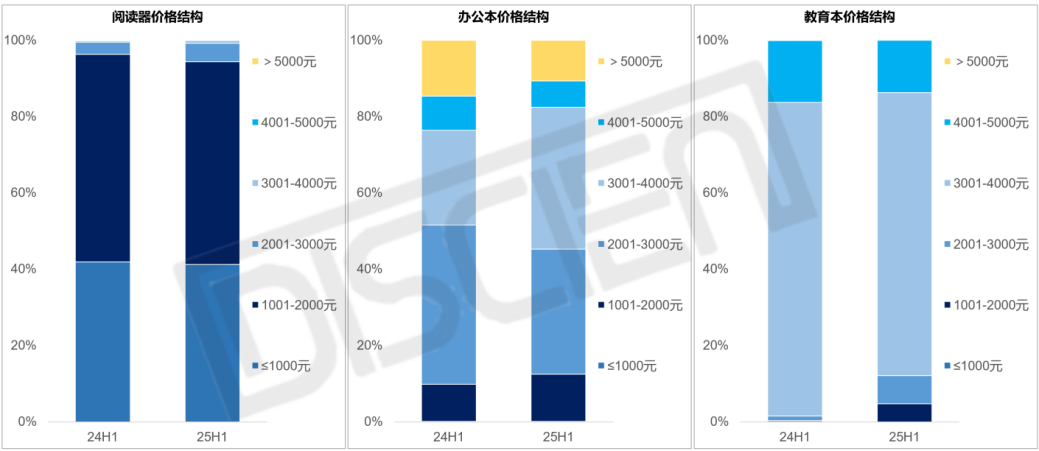 根据迪显数据,2025年上半年,阅读器价格虽集中于2000元以下,但呈现价格上升趋势——2001-3000元产品占比有所提升。同时,从功能及定位来看,办公本主力价格段开始向3001-4000元集中,教育本价格仍集中在3001-4000元。
