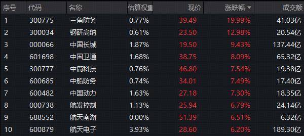 军工ETF华宝(512810)覆盖80只军工龙头股,74股收红。三角防务20CM涨停,钢研高纳涨近13%,中国长城继昨日涨停后爆量再涨9.43%航天电子大涨6.2%,成交189.3亿元跻身A股成交额前三