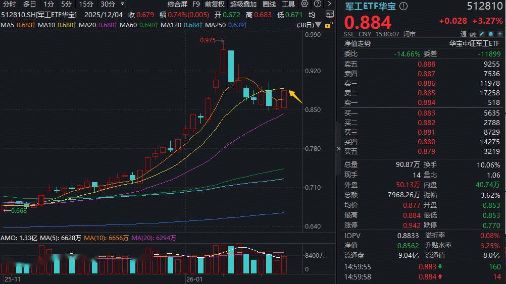 高人气军工ETF华宝(512810)全天高位运行,放量涨3.27%收于日内高点,日线成功连阳,成交7968万元,较上日大增三成。