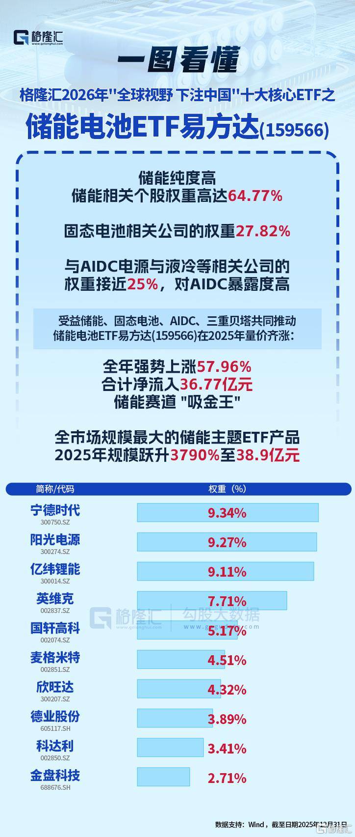 5张图看懂“2026年全球视野... 储能电池ETF易方达(159566)在2025年实现量价齐涨,全年强势上涨57.96%,规模从去年年...