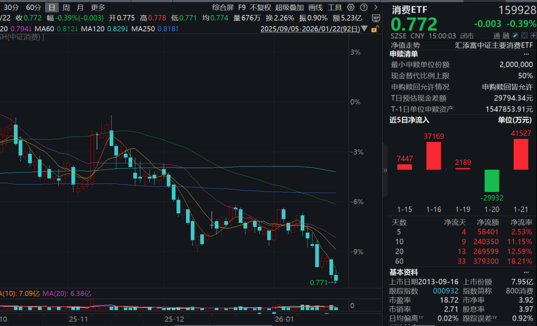 A股窄幅整理,大消费板块回调。消费ETF(159928)收跌0.39%,全天成交额超5亿元。资金面上,昨日大举揽金超4.1亿元,近5日累计净流入超5.8亿元。截至1月21日,消费ETF(159928)最新规模超230亿元,同类遥遥领先!