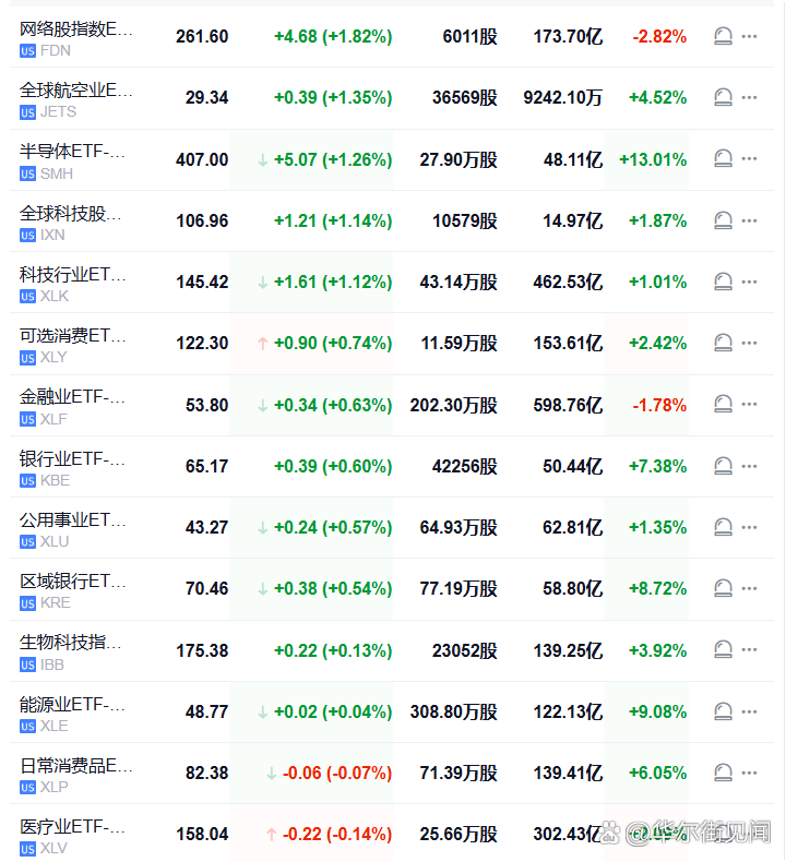 行业ETF美股盘初普遍走高,网络股指数ETF涨1.8%,全球航空业ETF、半导体ETF、全球科技股指数ETF、科技行业ETF至少涨1.12%。