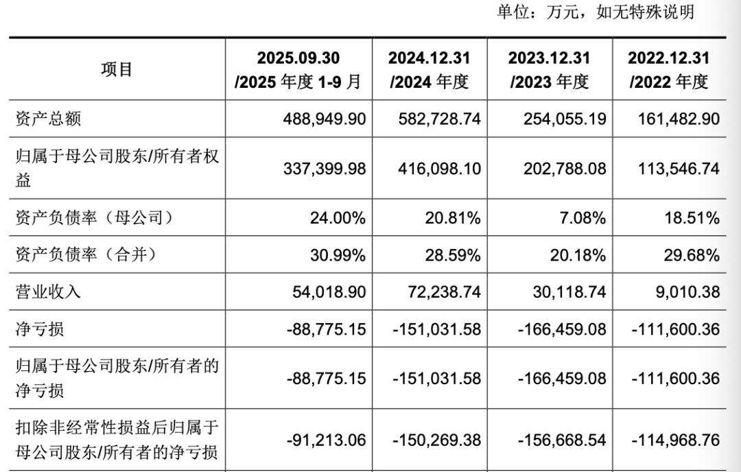财务数据显示,公司2022年至2025年前三季度实现营业收入分别为9010.38万元、3.01亿元、7.22亿元、5.4亿元; 实现归母净利润分别为-11.16亿元、-16.65亿元、-15.1亿元、-8.88亿元。2022年至2024年,公司营收复合增长率达到183.15%,规模快速增长中;